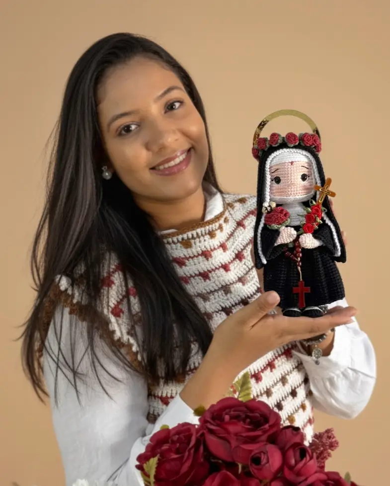 Símbolo de pureza e simplicidade, Santa Teresinha ensina a amar nas pequenas coisas. Sua santinha reflete doçura, leveza e o florescer da alma através do amor.